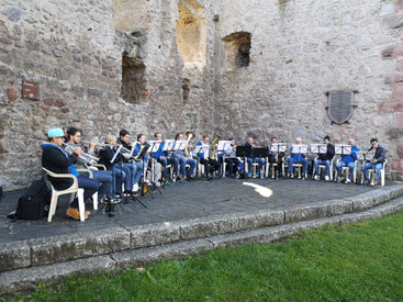 Entlang der Wanderroute gab es immer wieder feine Tropfen der Alde Gott Winzer sowie regionale Säfte, sowie leckeres vom Grill beim Mittagessen am Alten Schwimmbad. Aber nicht nur für das leibliche Wohl wurde gesorgt, auch die Ohren wurden verwöhnt durch musikalisch Klänge eines Querflötentrios und des Ensembles rund um unser Trompetenregister, welche die Wanderer dieses Jahr auf der Burg überraschten. Nicht zu vergessen unsere Specials, bei denen ein Suchspiel durch den Wald, ein Schubkarren-Geschicklichkeitslauf und das Angeln von Laufbachenten angesagt war. Zum Festhalten dieses schönen Tages bot sich ein Gruppenfoto beim extra dafür aufgestellten und dekorierten Fotorahmen an.